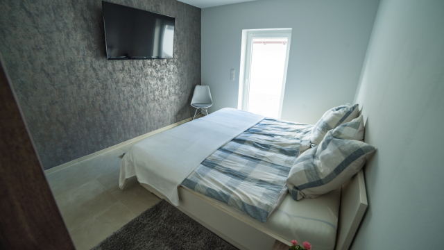 Sie wohnen in einer 45 m² Ferienwohnung. Unsere kleinere Wohnung verfügt über einen gemeinsamen Wohn –und Schlafbereich. Im Wohn –und Schlafbereich befindet sich ein großzügiger LCD-TV. Es erwartet Sie ein Tageslichtbad mit Dusche/WC, eine voll ausgestattet Küche und eine großzügige Terrasse.