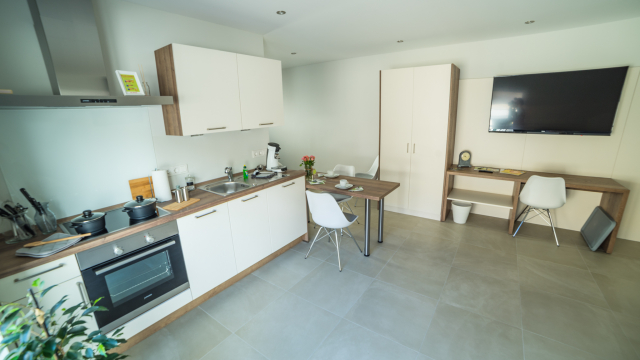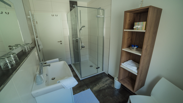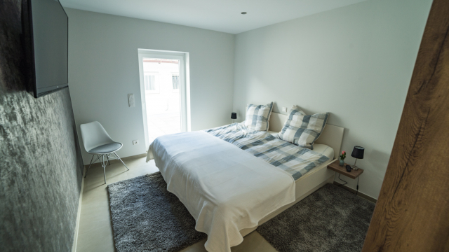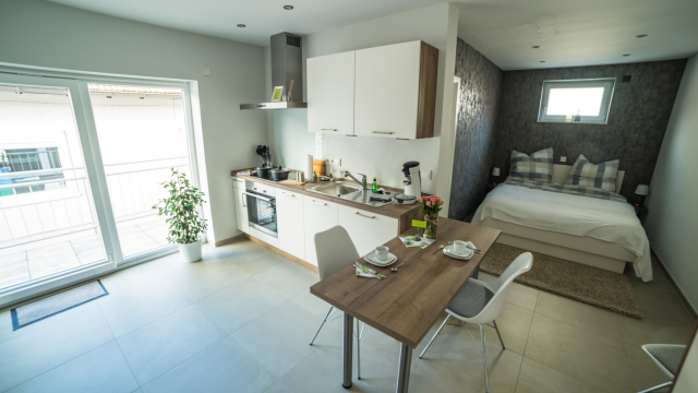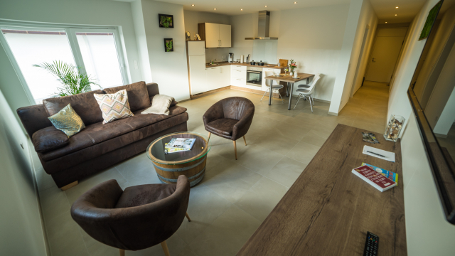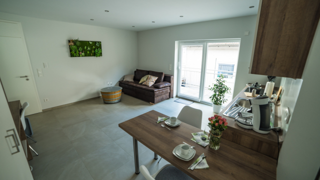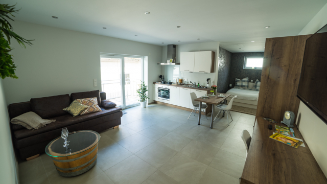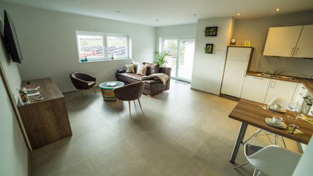 Sie wohnen in einer 45 m² Ferienwohnung. Unsere kleinere Wohnung verfügt über einen gemeinsamen Wohn –und Schlafbereich. Im Wohn –und Schlafbereich befindet sich ein großzügiger LCD-TV. Es erwartet Sie ein Tageslichtbad mit Dusche/WC, eine voll ausgestattet Küche und eine großzügige Terrasse.